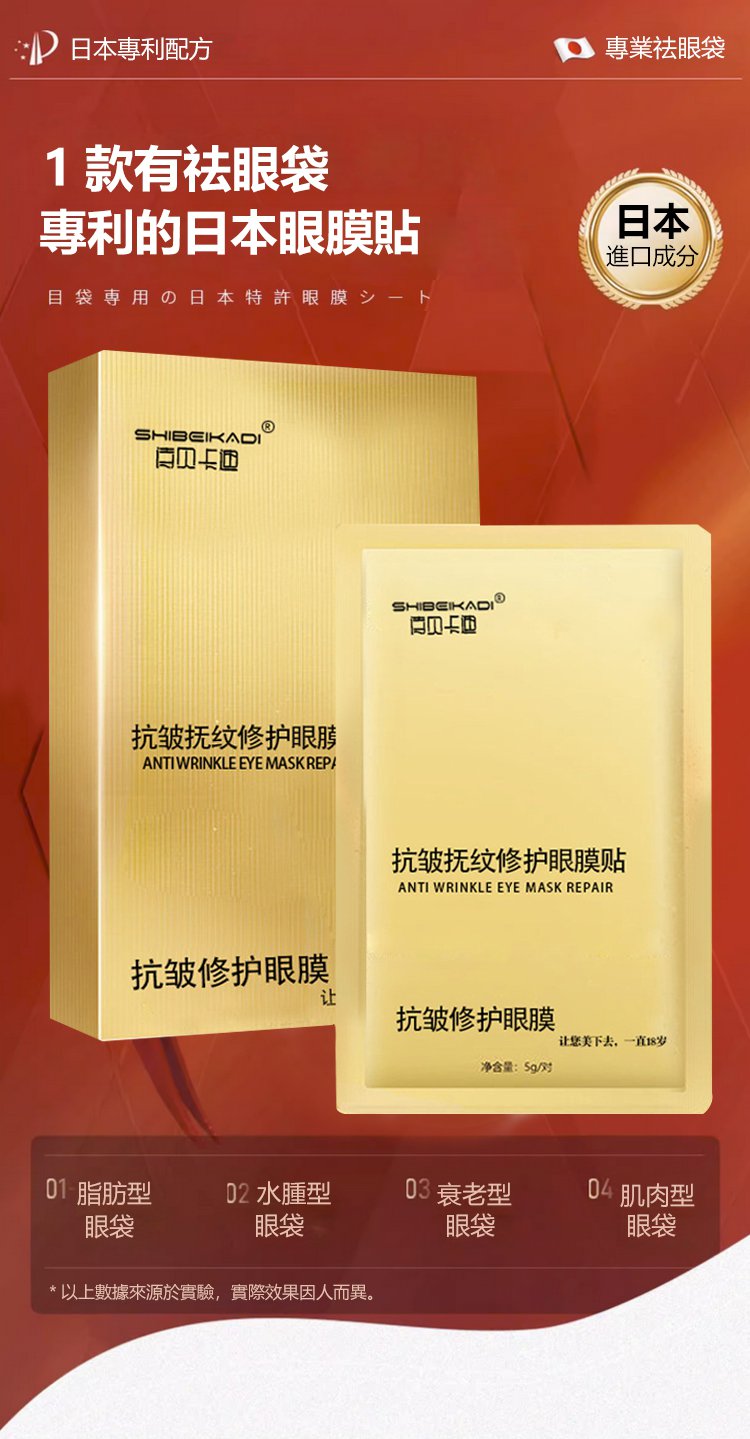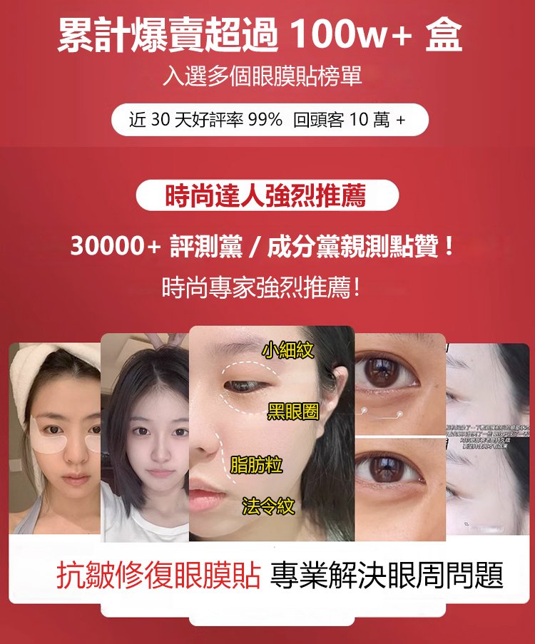20分鐘前每晚貼一貼,輕鬆淡化眼紋、眼袋,多買多送,僅限今天!免費包郵,不滿意直接退!快下單試試吧,用了你不會後悔! - 【限時瘋搶】2入組NT$1190(16對32貼初見成效)