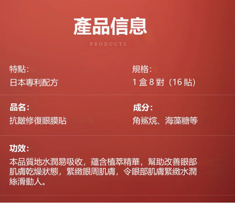 4分鐘前每晚貼一貼,輕鬆淡化眼紋、眼袋,多買多送,僅限今天!免費包郵,不滿意直接退!快下單試試吧,用了你不會後悔! - 【限時瘋搶】2入組NT$1190(16對32貼初見成效)