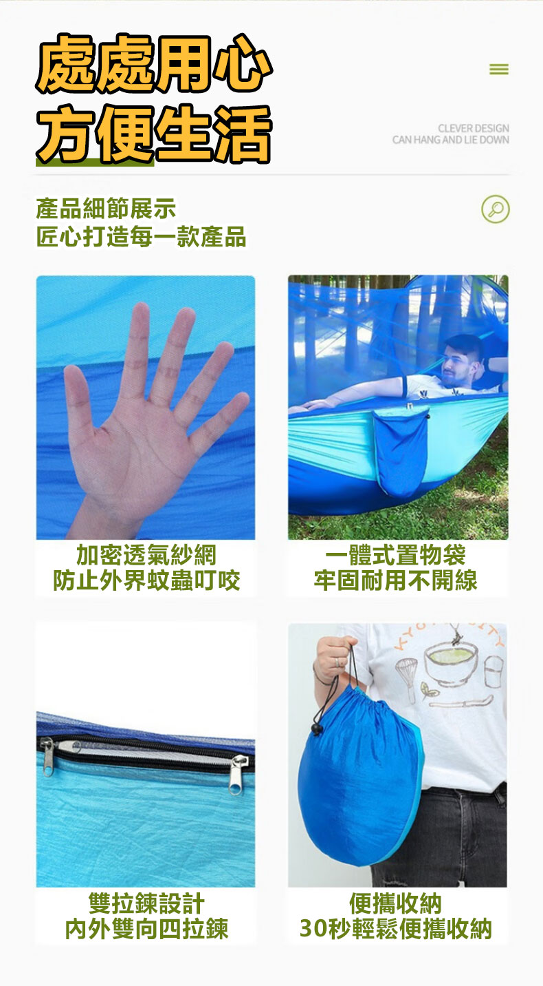 2分鐘前全自動速開戶外帶蚊帳吊床 - 【創意嘗鮮】承重700公斤 速開蚊帳吊床【帶蚊帳 三米綁繩 8號扣】/1入組NT$1298