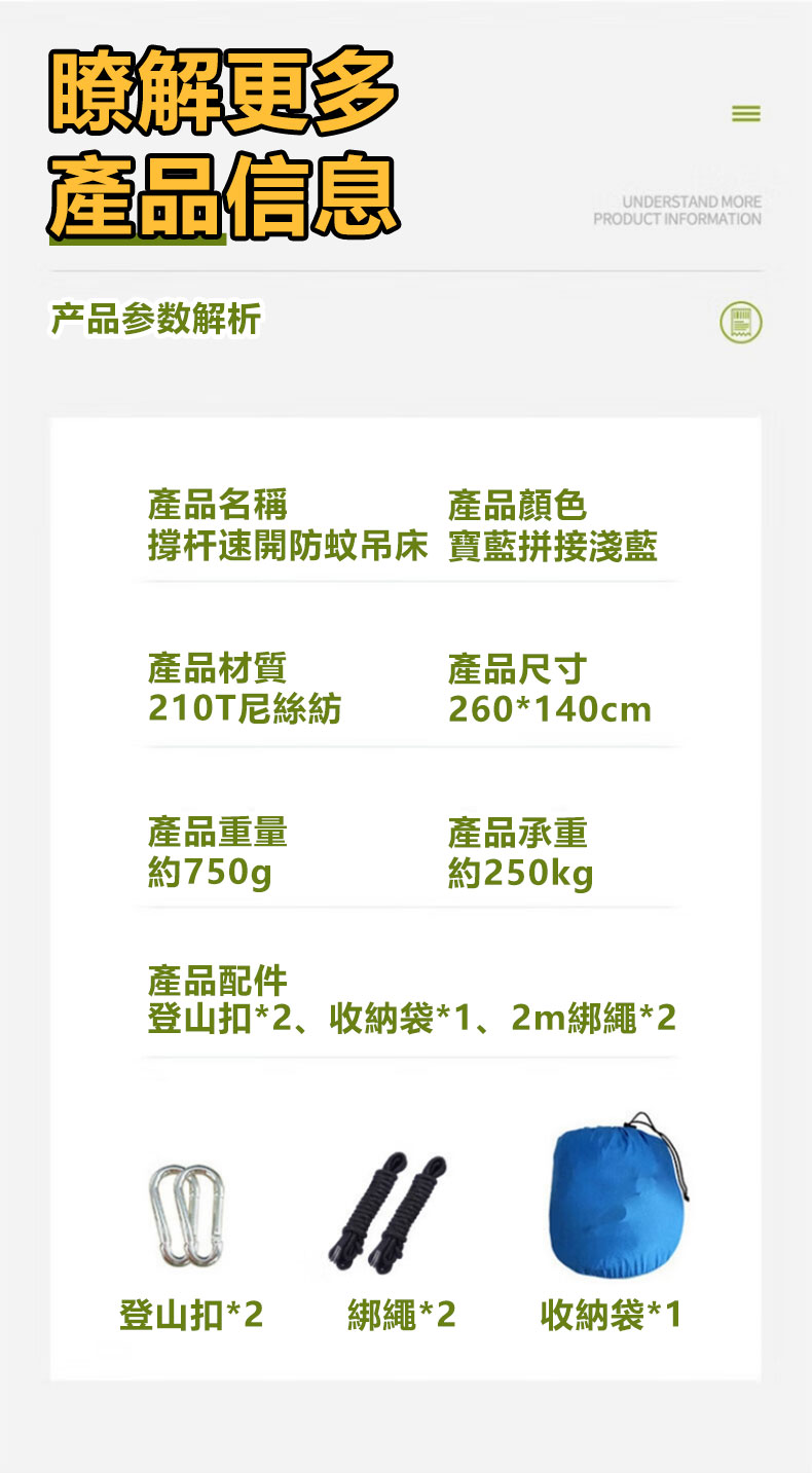 20分鐘前全自動速開戶外帶蚊帳吊床 - 【創意嘗鮮】承重700公斤 速開蚊帳吊床【無蚊帳+三米綁繩+8號扣】/1入組NT$998
